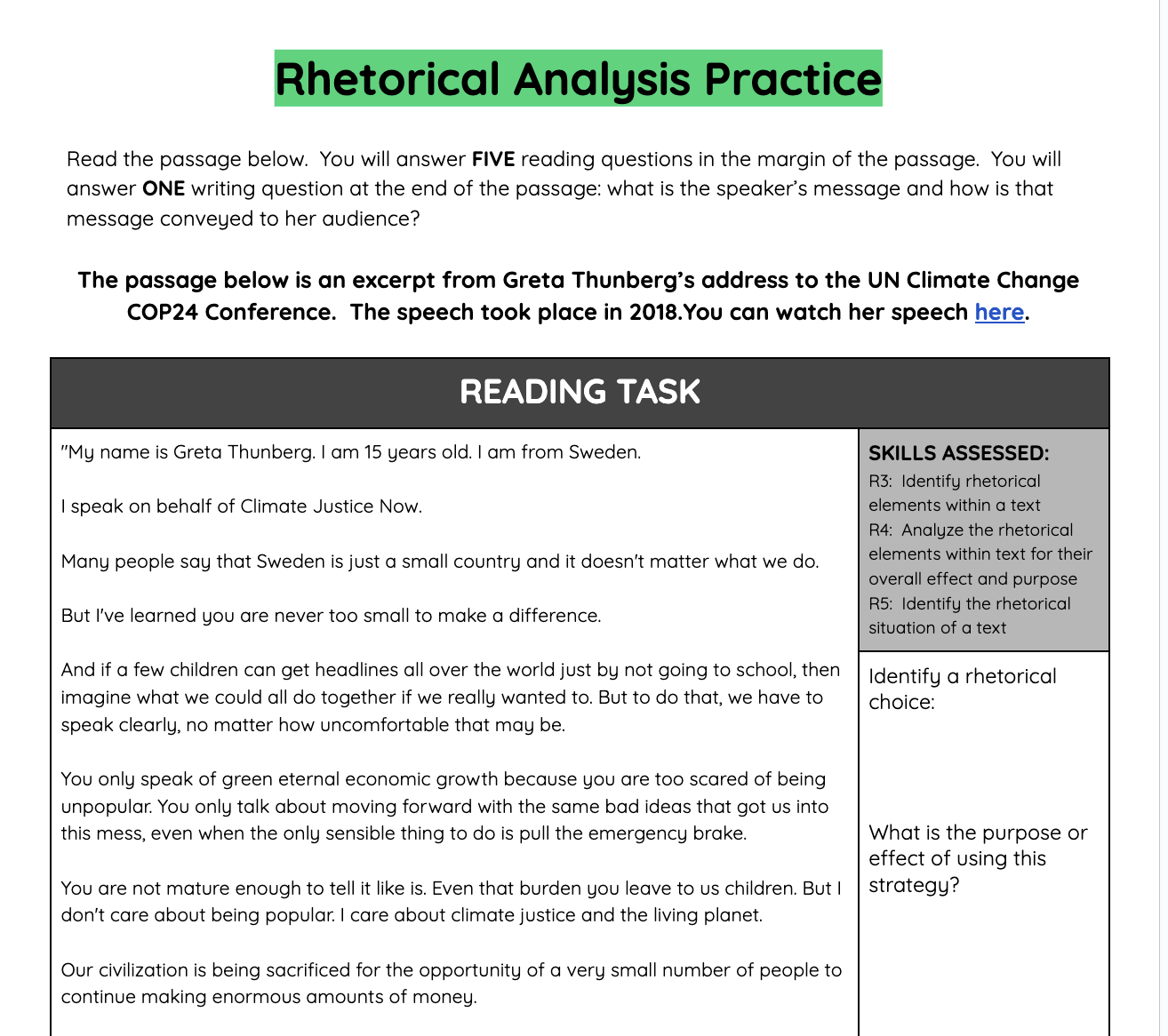 Supplement #1: Greta Thurnberg UN Climate Change Speech: Rhetorical Analysis Template